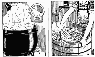 A common red color is dyed on a cotton, with two different kinds of vegetable dyewoods, namely, peachwood and barwood. The latter makes a more permanent color than the former. The cotton being boiled and prepared for opetarion, is first steeped for about eight or ten hours in a string decoction of sumac - about three pounds to the ten pounds of cotton, either in yarn or the piece. The goods must never be crowded too close in the vessels in which they are steeped, and no part of them should be suffered to rise above the liquor. This preparation is the same for both kinds of dyewoods. After the goods are lifted out of the sumac (if yarn, they are wrung, if pieces, they are suffered to drip well,) and then entered into the "spirit tub." This is a standing tub of the nitro murate of tin, described on the page 130; in which they receive five turns or handlings, and are then sunk under the liquor for about one hour and a half. They are then lifted, suffered to drip for a few minutes, wrung (if yarn,) and afterwards washed in clean water. If for bar-wood, great care must be exercised that no free acid is left in them; this can easily be detected by tasting them - the usual way. It requires about one pound of bar-wood to color one pound of cotton, and this is always done in a boiler bath. The yarn is wrung up, when washed out of the spirits, or if pieces, they are well dripped and run upon a winch. The bath should be a long rectangular copper kettle for yarn, if heated with a fire underneath, or it should be a water-tight long wooden box if heated with steam. The bar-wood is fisrt introduced, and allowed to boil for about fifteen minutes, then it is put off the boil with a pailfull of cold water, and the goods are entered and handled well over pins, or the winch, for about a quarter of an hour, when the liquor is brought to the boil and kept boiling for half an hour, when the goods will have attained to a good full color. Some enter the goods into the bar-wood liquor when cold, and bring it gradually up to the boil in half an hour, and keep it at this heat for half an hour longer. If the goods are to be dyed with peach wood, about six pounds are used for every ten of the goods. This wood is simply boiled for about fifteen minutes (if finely ground,) then put off the boil, and the clear liquor lifted out into a tub or tubs and equally divided for the quantity of goods to be dyed. The goods are then entered and handled quickly for fifteen minutes, then lifted, and about a small tea cupfull of spirits from the standing tub is added to the liquor., and well stirred. The goods are then re-entered, handled for ten minutes, and being raised, as it is termed, are then lfited,washed, and wrung for drying. Bar-wood reds require much washing if the goods are boiled in the liquor; peach-wood reds require but little washing. Some add two pounds of cam-wood to every eight of bar-wood, but use so much less of the latter dye wood. - Unless the bar-wood is good, and it is easy to deceive the eye with its appearance, a good full color cannot be produced.