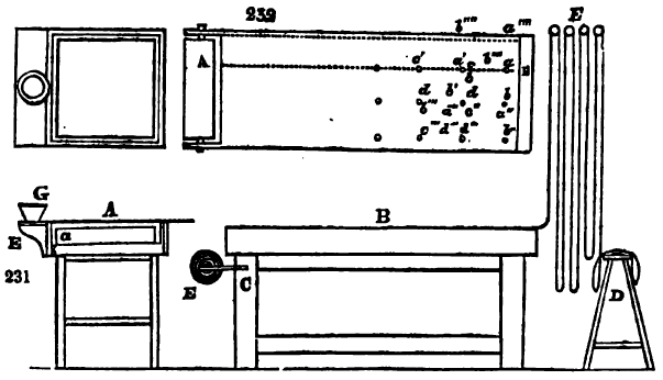 Fig. 251 [puuttuu] represents the construction of this ingenious apparatus, shown partly in section. a a is a vessel of iron, supported upon wooden standards b b, over the upper surface of which vessel a sheet of diaphragm, c c, of oiled cloth, or other suitable elastic material, is distended and made fast at its edges by being beat over a flange, and packed or cemented to render the joints water-tight. A vertical pipe d is intended to conduct water to the interior of the vessel a, and, by a small elevation of the column, to create such upward pressure as shall give to the diaphragm a slight bulge like the swimming tub.